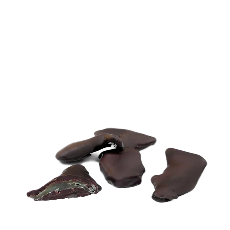 Kandierter Ingwer in Zartbitterschokolade. Angenehm süß scharfe, kandierte Ingwerstückchen aus Thailand in zarter Vollmilchschokolade