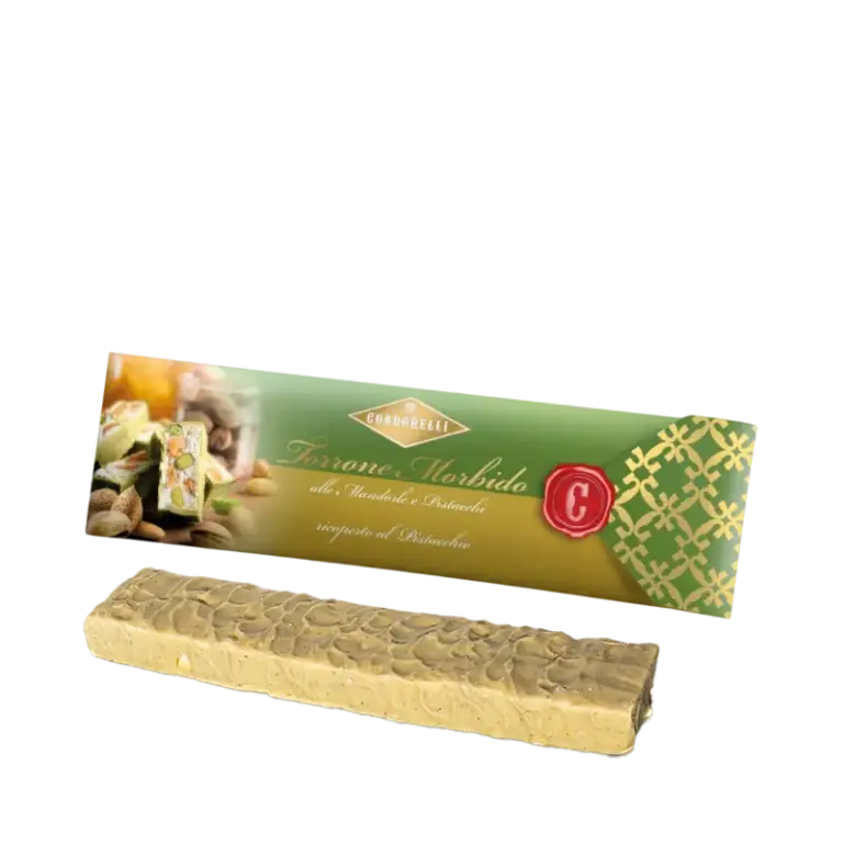 Eine besondere Spezialität ist auch unser feines Torrone mit Pistazien. Dieser weiche, weiße Nougat besteht aus einem süßen Teig aus schneeweißem cremig aufgeschlagenem Eiweiß und wird mit aromatischen Pistazien verfeinert, was dem Torrone eine besondere Note verleiht. Es ist so zart-weich, dass man sich kleine Genießer freundliche Stückchen mit den Fingern abzupfen kann.