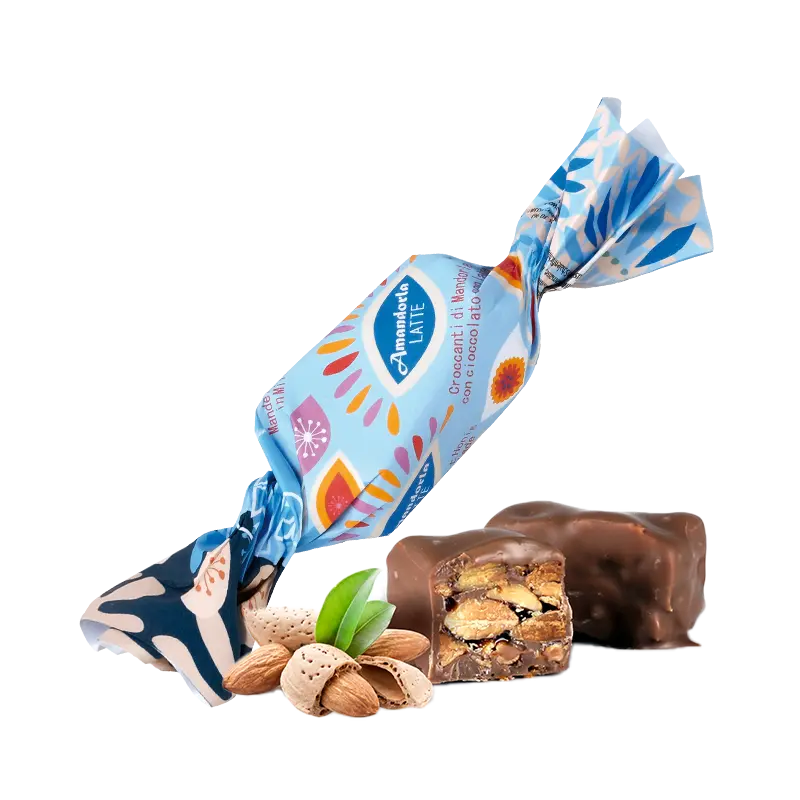 In Vollmilchschokolade getauchtes kalabrisches knuspriges Mandelkrokant, aus besten mit Orangenblütenhonig und Zucker karamellisierten Avola-Mandeln. Einzeln verpackt.
