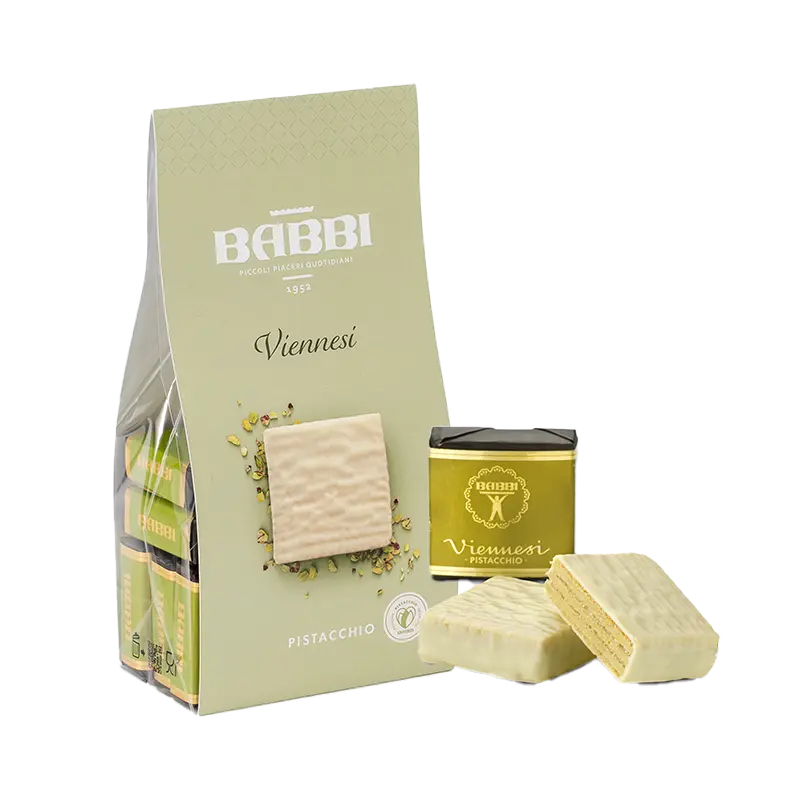 Unter den Händen von Attilio Babbi entstanden 1958 mit höchster Konditiorenkunst, die vielleicht besten Waffeln der Welt. Die Viennesi wurden zum Symbol-Produkt von BABBI: Drei sehr feine Waffelschichten, die mit einer raffinierten Pistaziencreme bestrichen und mit hochwertiger weiße Schokolade umhüllt sind.