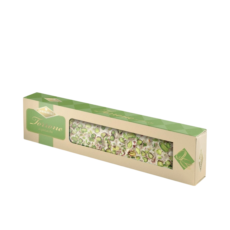 Torrone mit Pistazien – zart schmelzender Nougat, veredelt mit 48 % knackigen sizilianischen Pistazien. Erlebe puren Geschmack und authentischen Genuss voller italienischer Tradition.