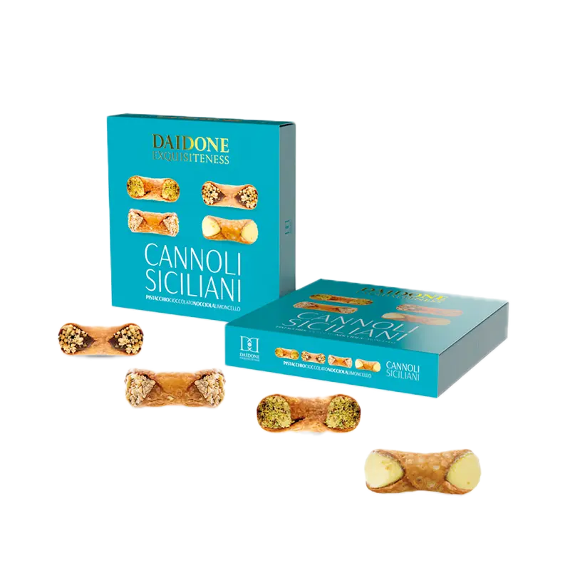 Unsere Cannolis stammen von Daidone Exquisiteness. Warum wählen wir diesen Lieferanten? Durch jahrelange Forschung möchte Daidone seine Fähigkeiten verfeinern und den Geschmacksausdruck der Cannolis verbessern. All dies, um dir einen unvergesslichen Genussmoment zu bereiten – für dich selbst oder zum Teilen mit deinen Liebsten. Daidone arbeitet bei seinen Produkten mit drei grundlegenden Eigenschaften: