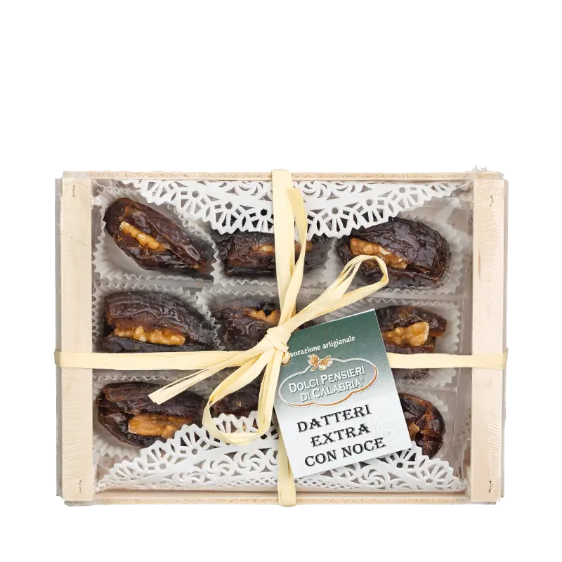 Entdecke die köstlichen Dolci Pensieri Datteln, gefüllt mit Walnuss – eine wahre Delikatesse für Genießer. Die große, weiche Medjool-Dattel gilt als Königin unter den Datteln und besticht durch ihre saftige Textur und natürlichen Süße.