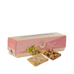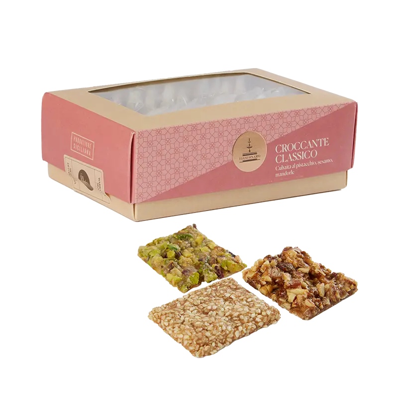 Fiasconaro verfeinert das Krokant Gebäck mit den Zutaten der Region: Mandeln, Pistazien und Sesam. Hauchdünn und knuspig gebacken und einzeln verpackt. So sorgt das sizilianische Krokantgebäck für eine delikate Ergänzung zum Espresso nach dem Essen. Oder genießen Sie es einfach zum pur!