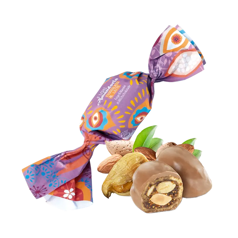 n der Sonne Kalabriens gereifte Feigen mit einem Kern aus in Orangenblütenhonig karamellisierten Mandeln, getaucht in Vollmilchschokolade. Einzeln verpackt.