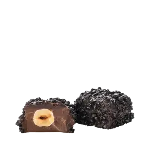 Eine ganze Piemonteser Haselnuss IGP ist umgeben von einer Giandujacreme und einem zartbitterem Schokoladenmantel und 75%igen Chocoviarsplittern. Cremig und für Veganer geeignet!